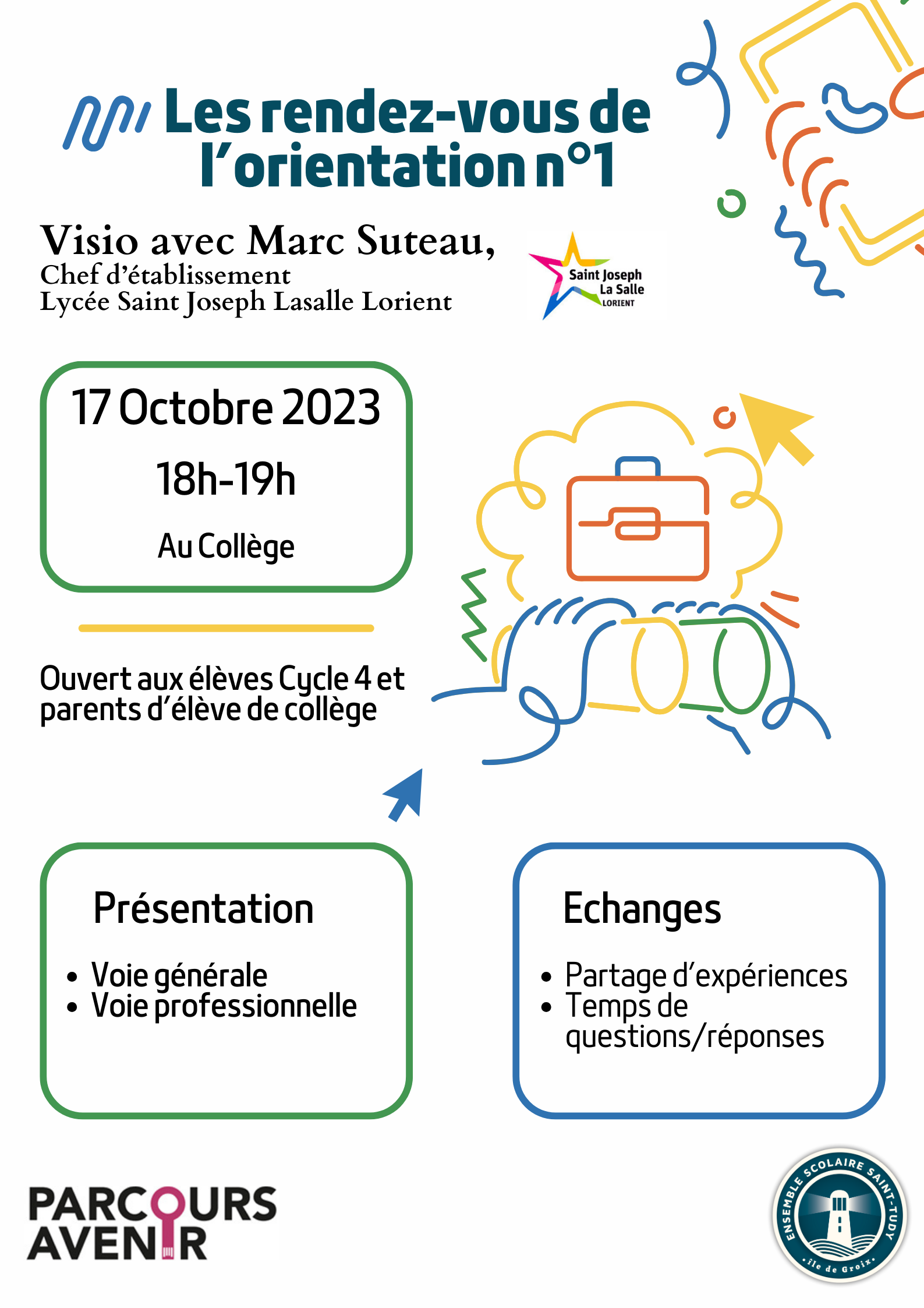 L’après 3ème, ça se prépare. Dans le cadre du parcours avenir, nous convions les élèves de cycle 4 ainsi que leurs parents à une visio-orientation avec Marc Suteau, chef d’établissement du lycée général et technologique de Saint Jo-Lorient.