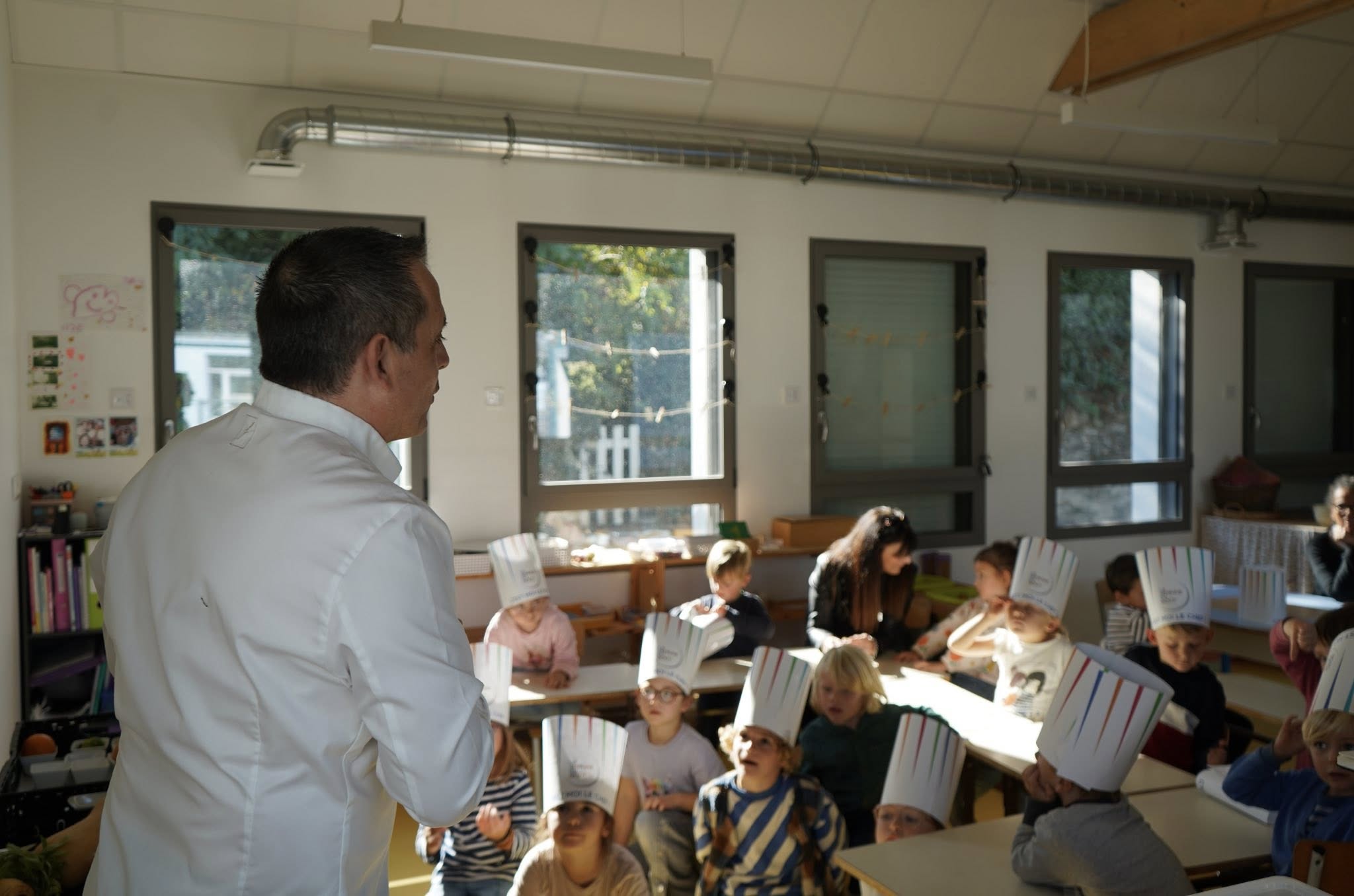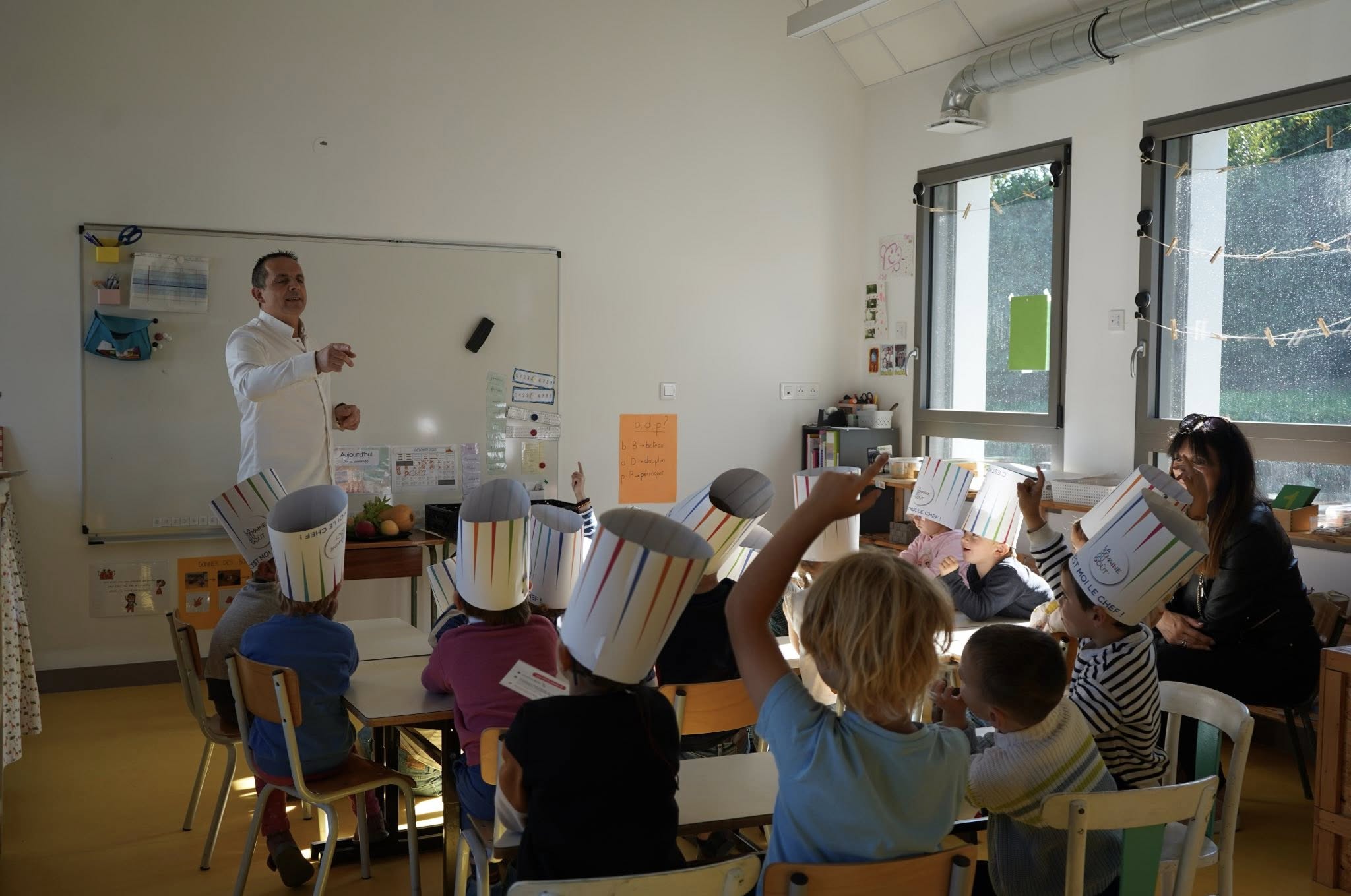 Vendredi 17 octobre 2025, les élèves de maternelle (moyens et grands) ainsi que les CP ont eu la chance d’accueillir Olivier et Sandrine du Restaurant La Marine Groix.